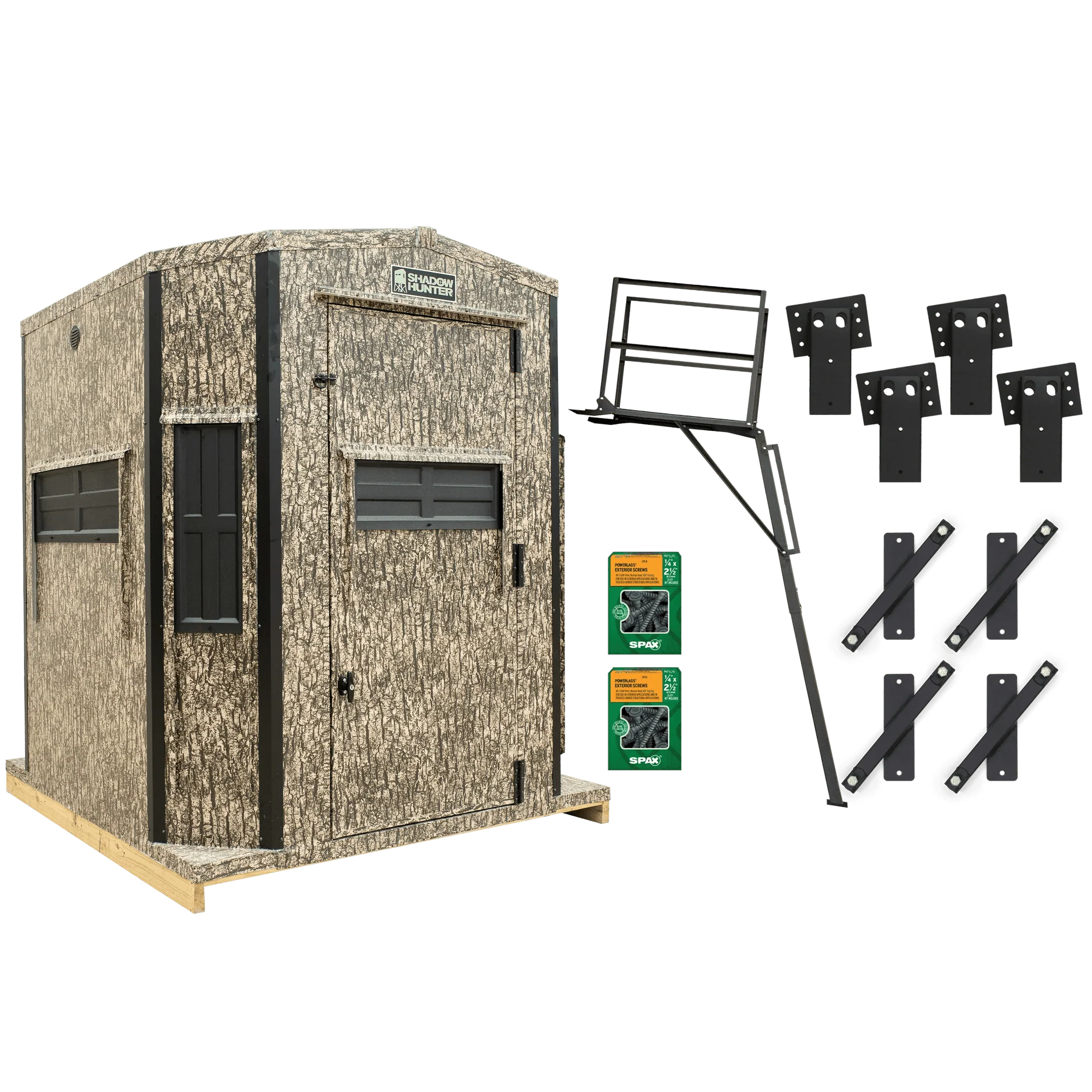 This bundle includes everything needed to build your own deer blind tower—just add lumber. The adjustable stair platform allows height customization in 2-foot increments, up to 10 feet.