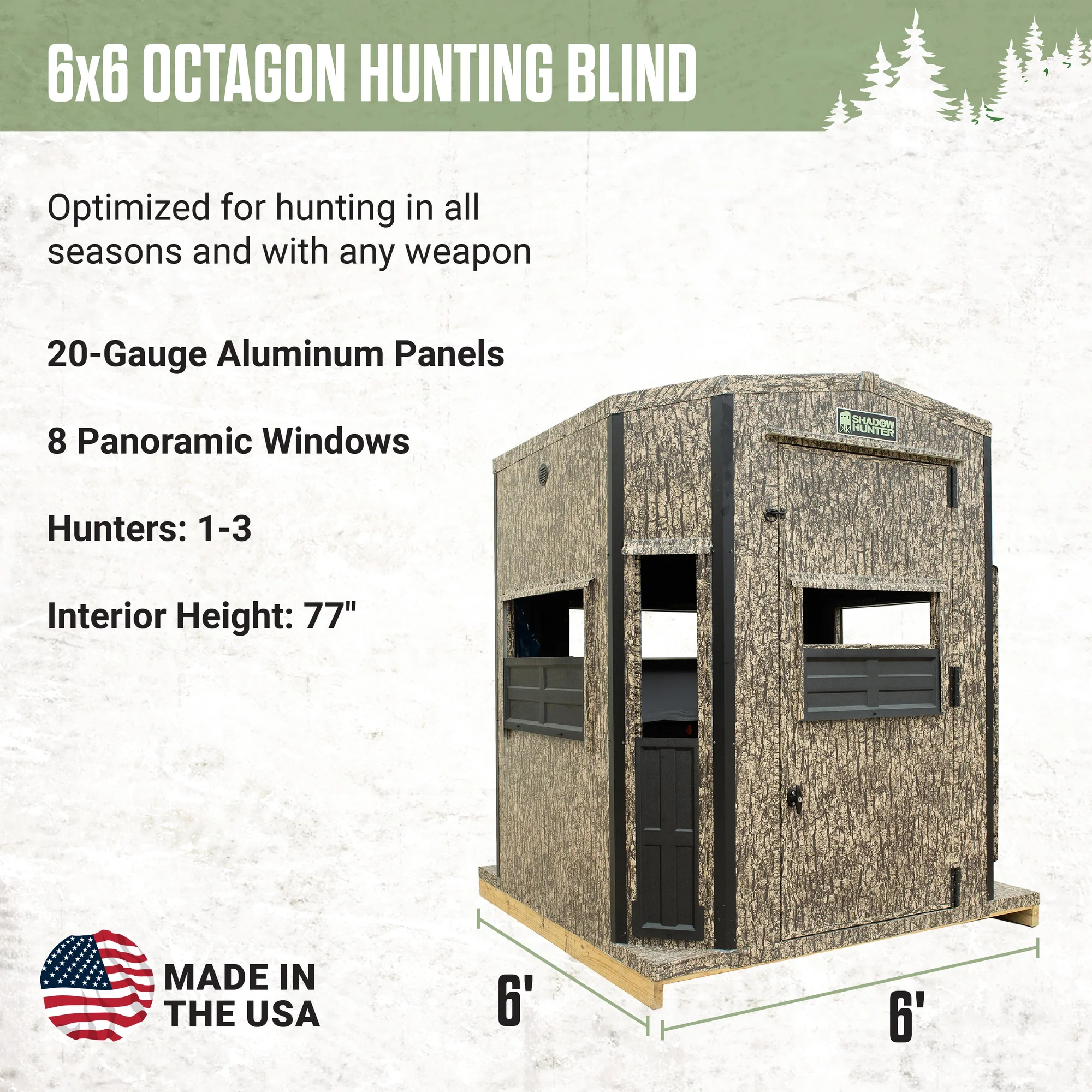 Designed for all-season performance and multi-weapon versatility, the Hunting Blinds for Sale 6×6 Octagon Combo continues to be our best-selling model year after year. Its spacious interior is ideal for hunting with friends, while three strategically sized window configurations provide full 360-degree coverage for gun, crossbow, and compound bow hunting.